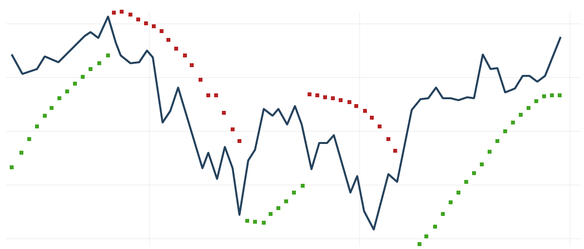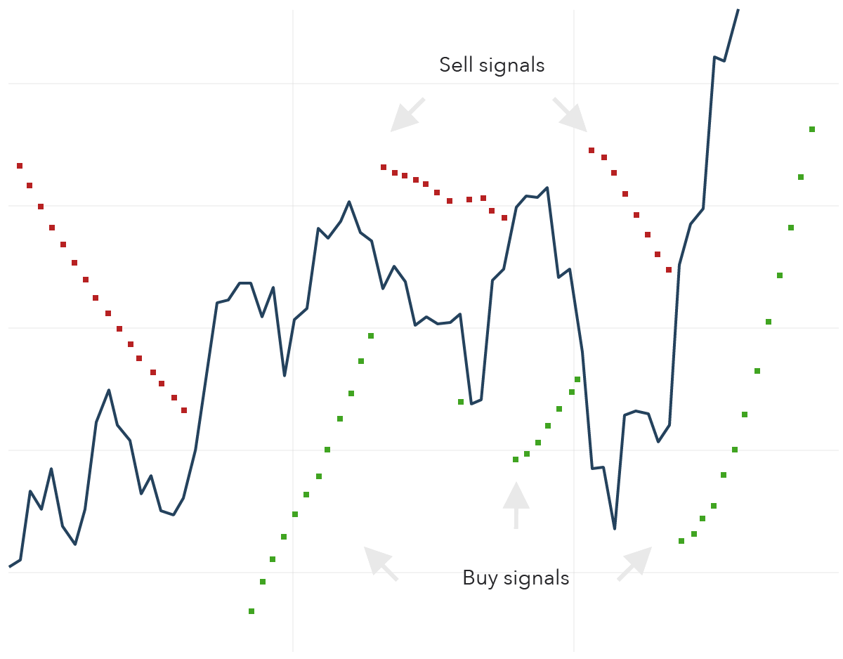 To trade using the parabolic SAR, you first need to understand what the different signals mean. The parabolic SAR will produce a series of dots – known as a parabolic line – above and below the price movements in an asset’s market chart. These dots will be either green or red.